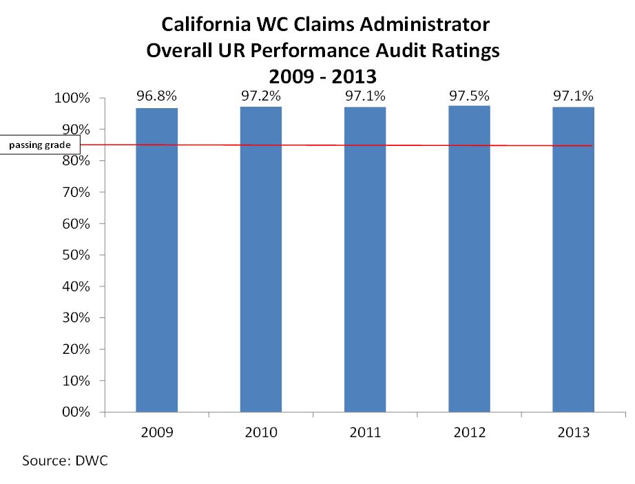 The results show claims administrators had remarkably consistent UR compliance rates from 2009 through 2013, with less than 1 percentage point variance across each of the five years, and an overall compliance rate averaging 97.2%, far above the 85% compliance rate which the state has set as a passing grade.