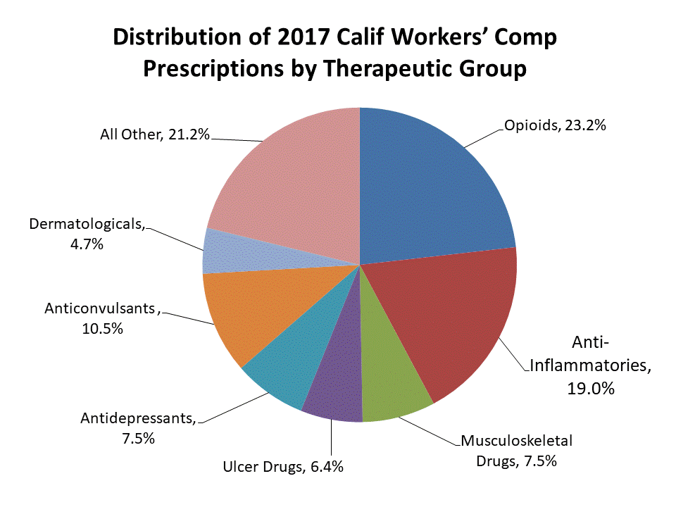 Oakland–Opioids remain the most common type of prescription drug used to treat California injured workers with lost-time injuries, but sustained efforts to curb their use are paying off as new data show that in the past decade they fell from about a third of indemnity claim prescriptions to less than a quarter, while there was a concurrent increase in anti-inflammatories and anticonvulsants which are often used as opioid alternatives.