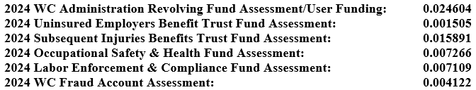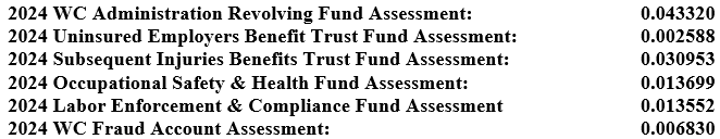 Oakland, CA — The California Department of Industrial Relations (DIR) has issued the 2024 assessments that workers’ compensation insurers are required to collect from policyholders to cover the budget of the state Division of Workers’ Compensation (DWC) and five related programs set up by state lawmakers. Insurers should apply the following rates against their policyholders’ estimated annual assessable premium for policies incepting January 1, 2024 through December 31, 2024: